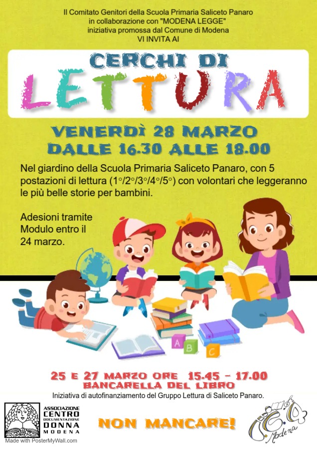 Venerdì 28 marzo 2025 dalle 16.30 presso la Scuola primaria Saliceto Panaro si terrà l’iniziativa Cerchi di lettura rivolta ai bambini e alle bambine della scuola nell’ambito di Modena Legge 2025 – Festa della lettura per la diversità, l’uguaglianza e una cultura internazionale nelle scuole di Modena.
