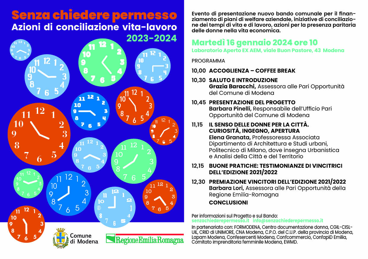 Martedì 16 gennaio 2024 alle ore 10.00 presso il Laboratorio Aperto (Ex AMCM, viale Buon Pastore 43) si terrà presentazione del nuovo bando comunale Senza chiedere il permesso per il finanziamento di piani di welfare aziendale e iniziative di conciliazione dei tempi di vita e di lavoro, azioni per la presenza paritaria delle donne nella vita economica”.