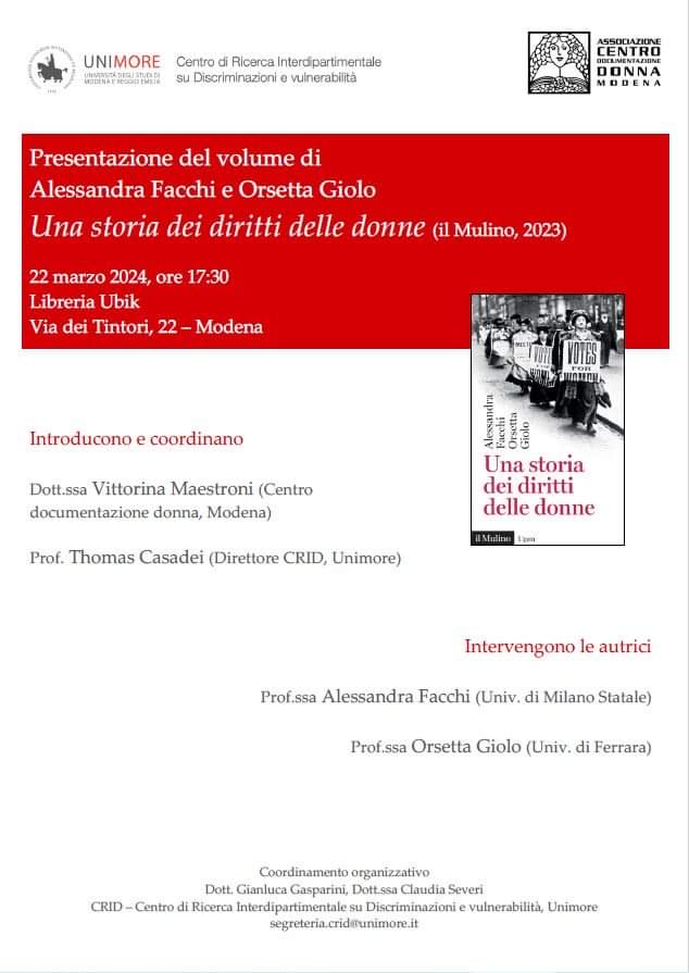 Venerdì 22 marzo 2024, a partire dalle ore 17.30, presso la Libreria Ubik (via dei Tintori 22, Modena) si terrà la presentazione del volume curato da Alessandra Facchi e Orsetta Giolo “Una storia dei diritti delle donne” (il Mulino, 2023)