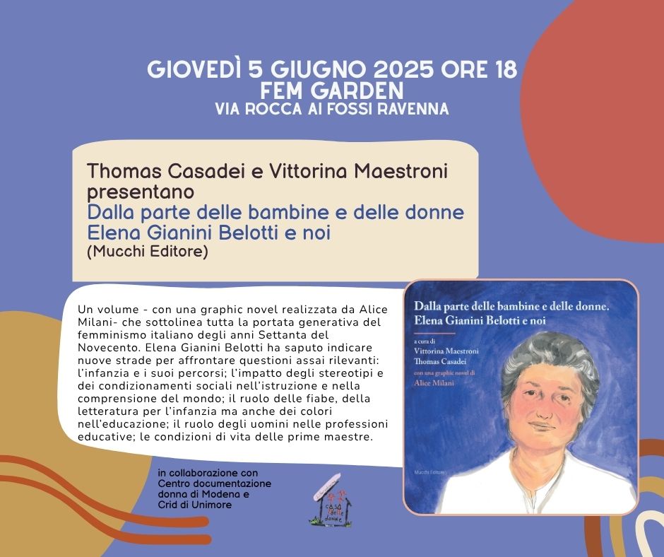 Giovedì 5 giugno 2025 ore 18.00 presso il Fem Garden di Ravenna (Via Rocca ai Fossi) si terrà la presentazione di Dalla parte delle bambine e delle donne. Elena Gianini Belotti e noi a cura di Vittorina Maestroni e Thomas Casadei con una graphic novel di Alice Milani (Mucchi editore, 2025) promosso da Casa delle donne di Ravenna in collaborazione con Centro documentazione donna e CRID Unimore