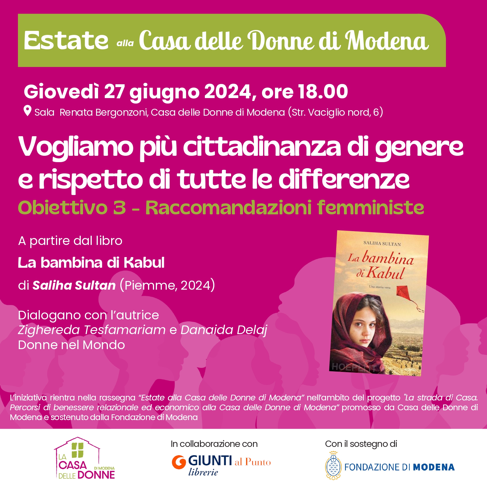 Dal 13 giugno al 4 luglio 2024 si terrà presso la Sala Renata Bergonzoni – Casa delle Donne (Str. Vaciglio nord 6, Modena) la rassegna Estate alla Casa delle Donne di Modena promossa dalla Casa delle Donne di Modena in collaborazione con Giunti al Punto – Librerie.