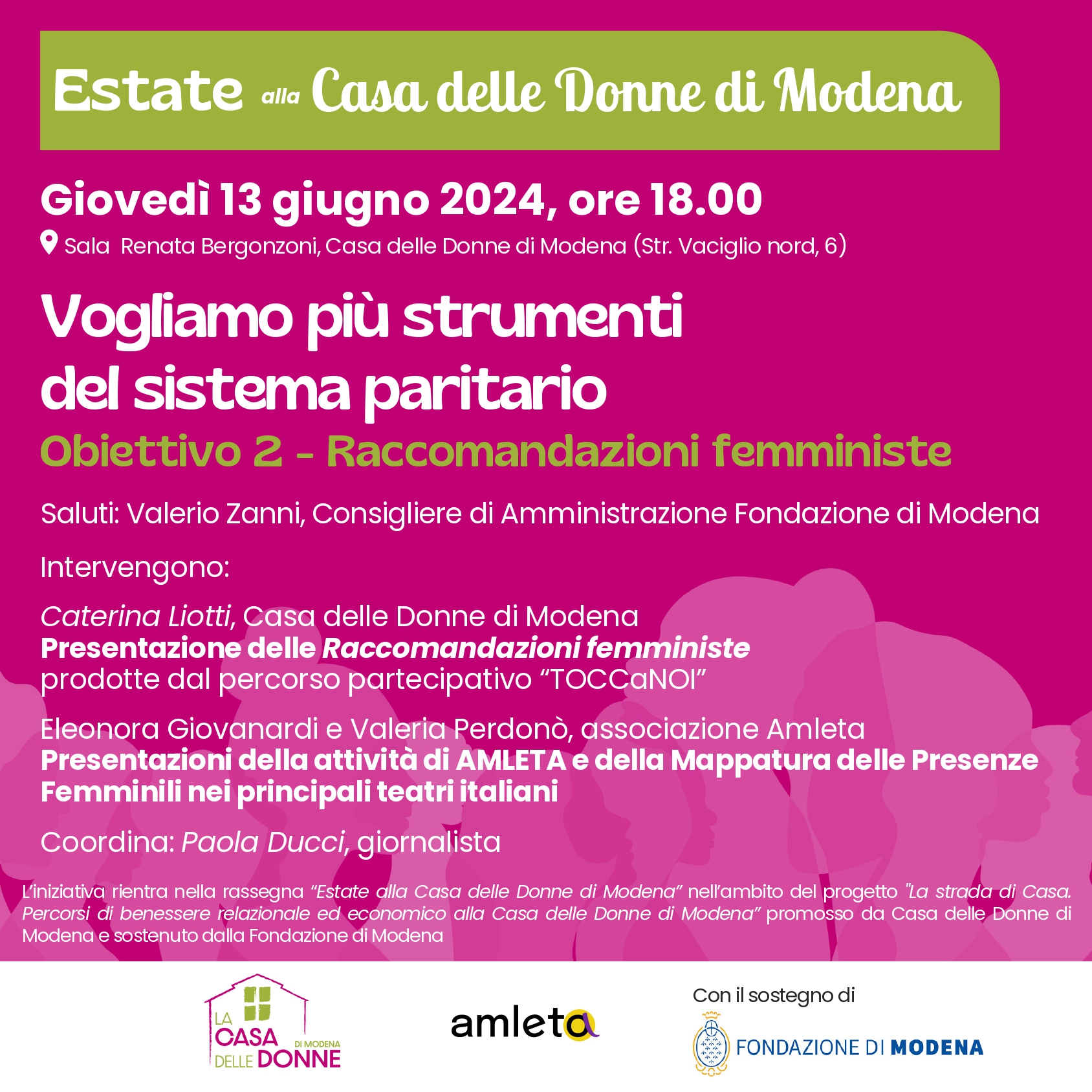 Dal 13 giugno al 4 luglio 2024 si terrà presso la Sala Renata Bergonzoni – Casa delle Donne (Str. Vaciglio nord 6, Modena) la rassegna Estate alla Casa delle Donne di Modena promossa dalla Casa delle Donne di Modena in collaborazione con Giunti al Punto – Librerie.