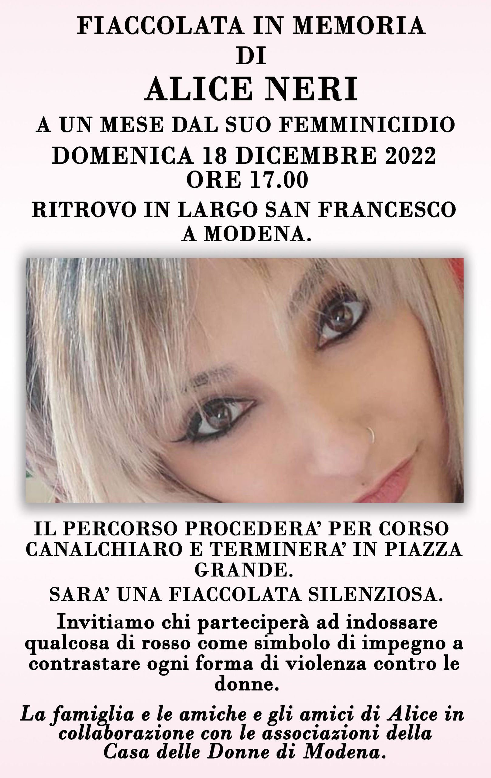 Domenica 18 dicembre 2022 alle ore 17.00 la famiglia e le amiche e gli amici di Alice Neri in collaborazione con la Casa delle Donne di Modena hanno organizzato una fiaccolata in memoria di Alice Neri, a un mese dal suo femminicidio.