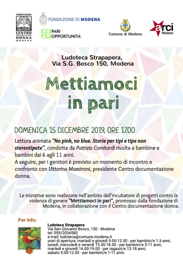 Domenica 15 dicembre 2019 alle ore 17.00 presso la Ludoteca Strapapera (via S.G Bosco, 150, Modena) si terrà la lettura animata “No pink, no blue. Storie per tipi e tipe non stereotipate” condotta da Patrizia Comitardi e rivolta a bambine e bambini tra i 6 e gli 11 anni. A seguire, per i genitori, è […]