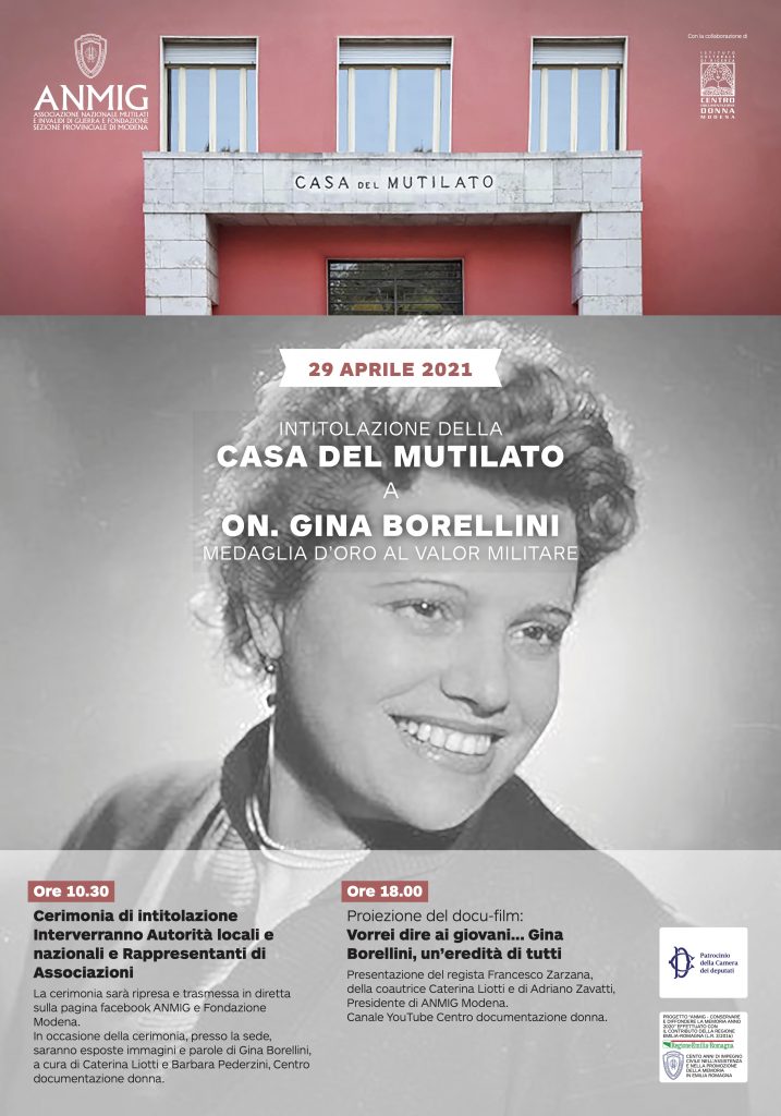 Giovedì 29 aprile 2021 – ore 10.30 In diretta web sulle pagine Facebook ANMIG e Fondazione Modena. Intitolazione della Casa del Mutilato all’On. Gina Borellini, Medaglia d’oro al valor militare alla presenza delle Associazioni e delle Autorità nazionali e cittadine. In occasione della cerimonia, presso la sede, saranno esposte immagini e parole di Gina Borellini, a cura di Caterina Liotti […]