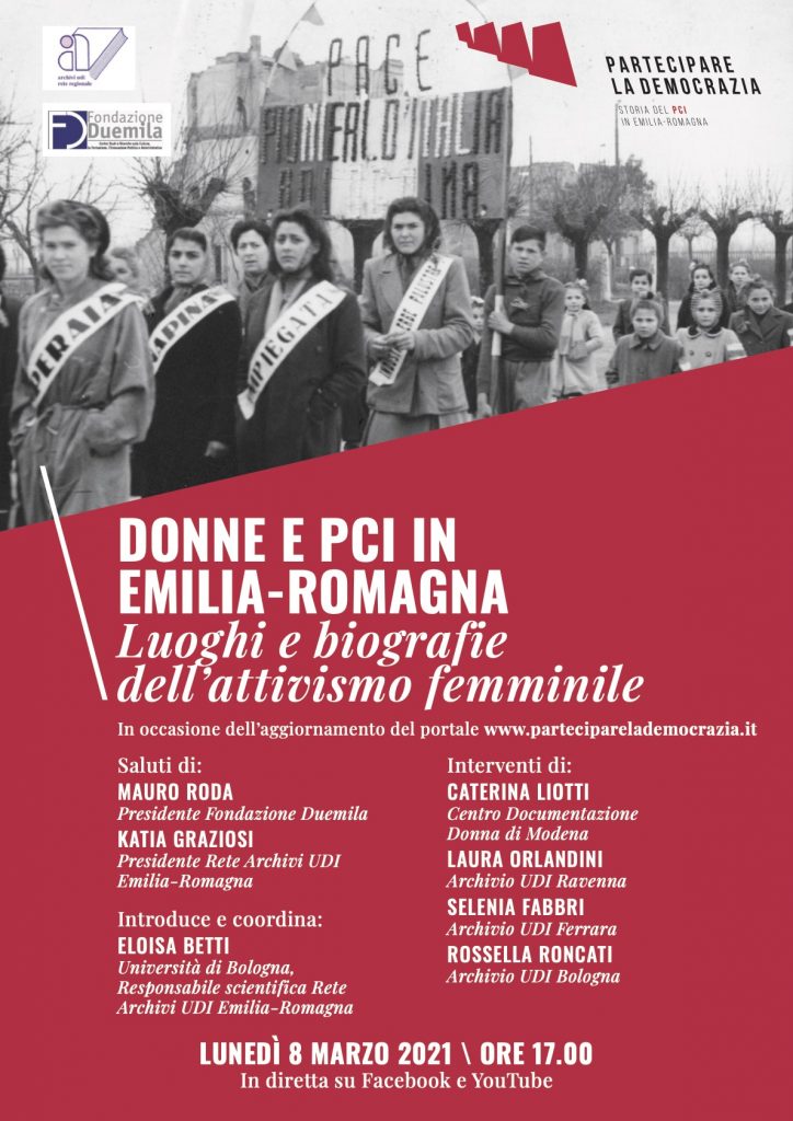 Lunedì 8 marzo 2021 alle ore 17.00 si terrà l’iniziativa online DONNE E PCI IN EMILIA-ROMAGNA. Luoghi e biografie dell’attivismo femminile in occasione dell’aggiornamento del portale www.parteciparelademocrazia.it dedicato al progetto “Storia del Pci in Emilia-Romagna” sul centenario della nascita del Partito Comunista d’Italia. L’iniziativa è promossa da Fondazione Duemila di Bologna e Rete Archivi Udi Emilia-Romagna e sarà visibile sulle pagine Facebook Fondazione Duemila e Partecipare la Democrazia. Saluti: Mauro […]