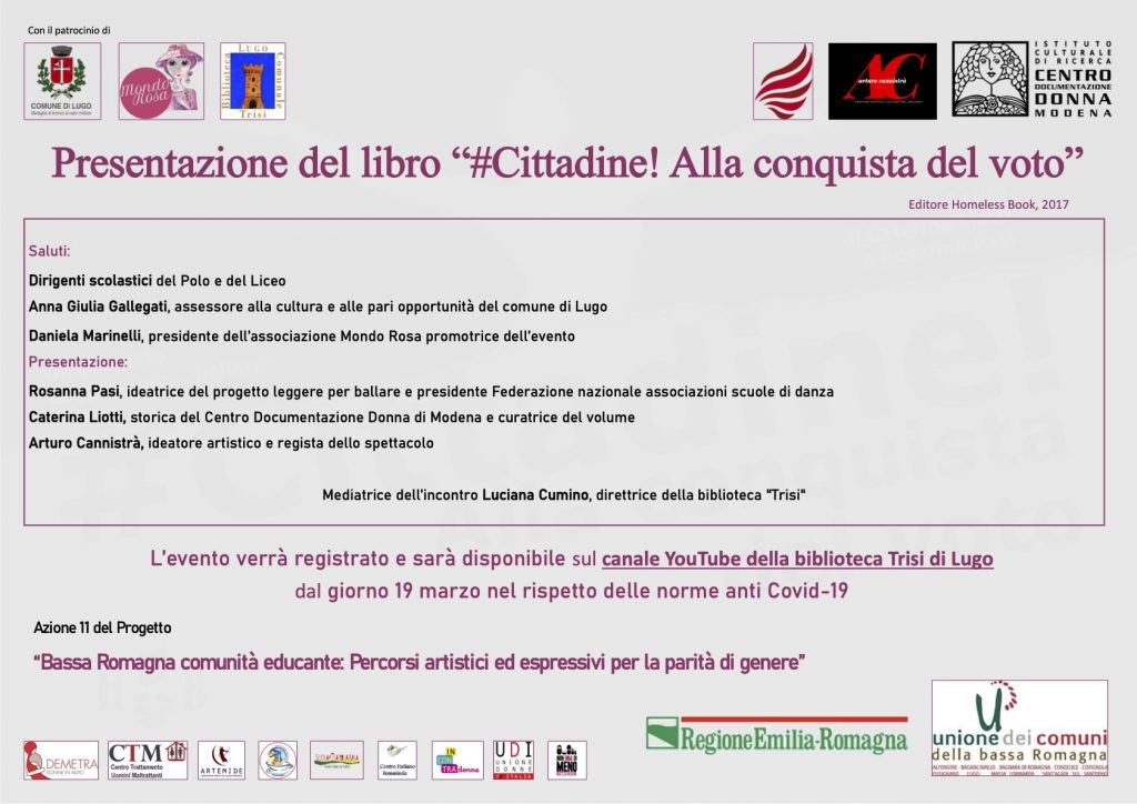 Venerdì 19 marzo 2021 sarà disponibile sul canale YouTube della biblioteca Trisi di Lugo (RA) l’incontro di presentazione del libro #Cittadine! Alla conquista del voto (Homeless Book, 2017). Saluti: Dirigenti scolastici del Polo e del Liceo Anna Giulia Gallegati, Assessora alla cultura e alle pari opportunità del comune di Lugo Daniela Marinelli, Presidente dell’associazione Mondo Rosa […]