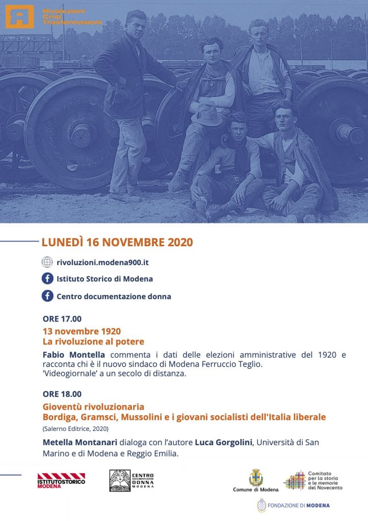 Lunedì 16 novembre 2020 si terranno due iniziative online: Ore 17.00 13 novembre 1920. La rivoluzione al potere. Fabio Montella commenta i dati delle elezioni amministrative del 1920 e racconta chi è il nuovo Sindaco di Modena Ferruccio Teglio. Un “videogiornale” a un secolo di distanza. Il video sarà visibile su questa pagina e sulle pagine […]