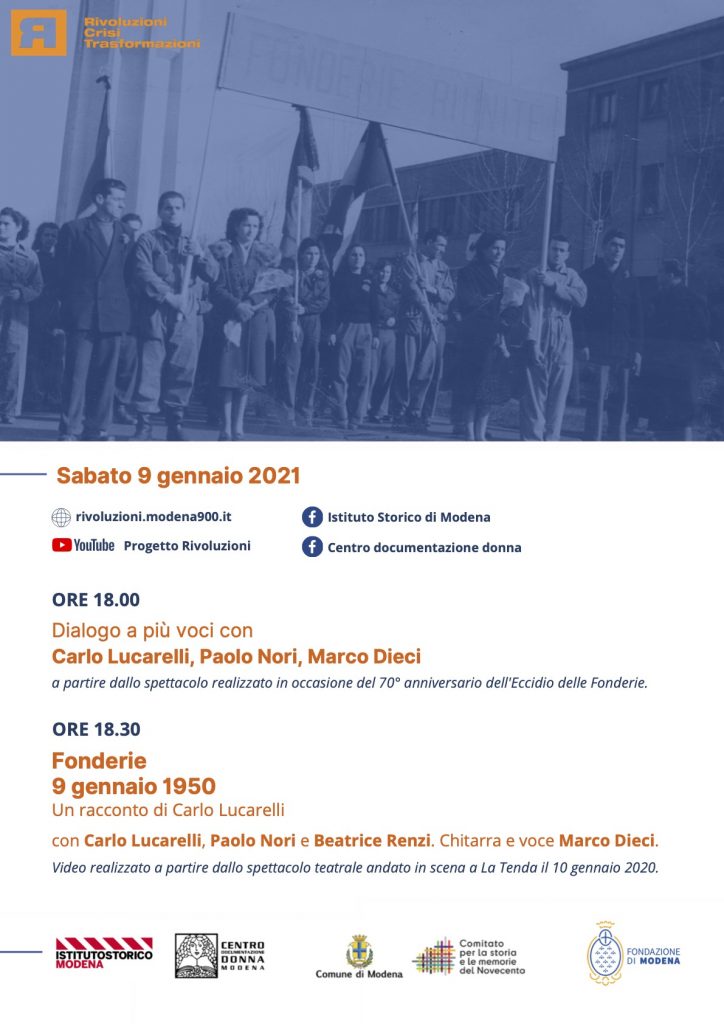 Sabato 9 gennaio 2021 alle ore 18.00 in diretta web sul sito e sul canale You Tube del progetto Rivoluzioni e sulle pagine Facebook dell’Istituto Storico di Modena e del Centro documentazione donna si terrà il dialogo a più voci con Carlo Lucarelli, Paolo Nori e Marco Dieci a partire dallo spettacolo realizzato in occasione del 70° anniversario dell’Eccidio delle Fonderie Riunite di Modena. Successivamente, alle ore 18.30, sarà visibile sugli stessi […]