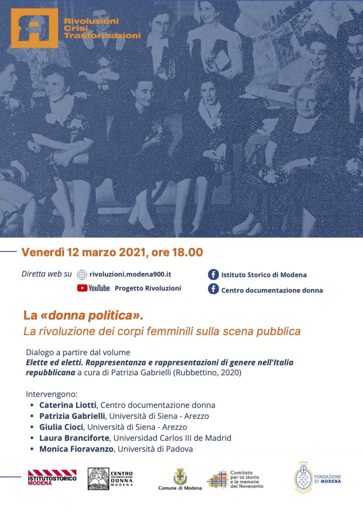 In occasione dell’8 marzo – Giornata internazionale della donna, venerdì 12 marzo alle ore 18.00, in diretta web su sul sito e sul canale You Tube del progetto Rivoluzioni e sulle pagine Facebook dell’Istituto Storico di Modena e del Centro documentazione donna, si terrà l’iniziativa La «donna politica». La rivoluzione dei corpi femminili sulla scena pubblica, un dialogo a partire dal volume “Elette […]
