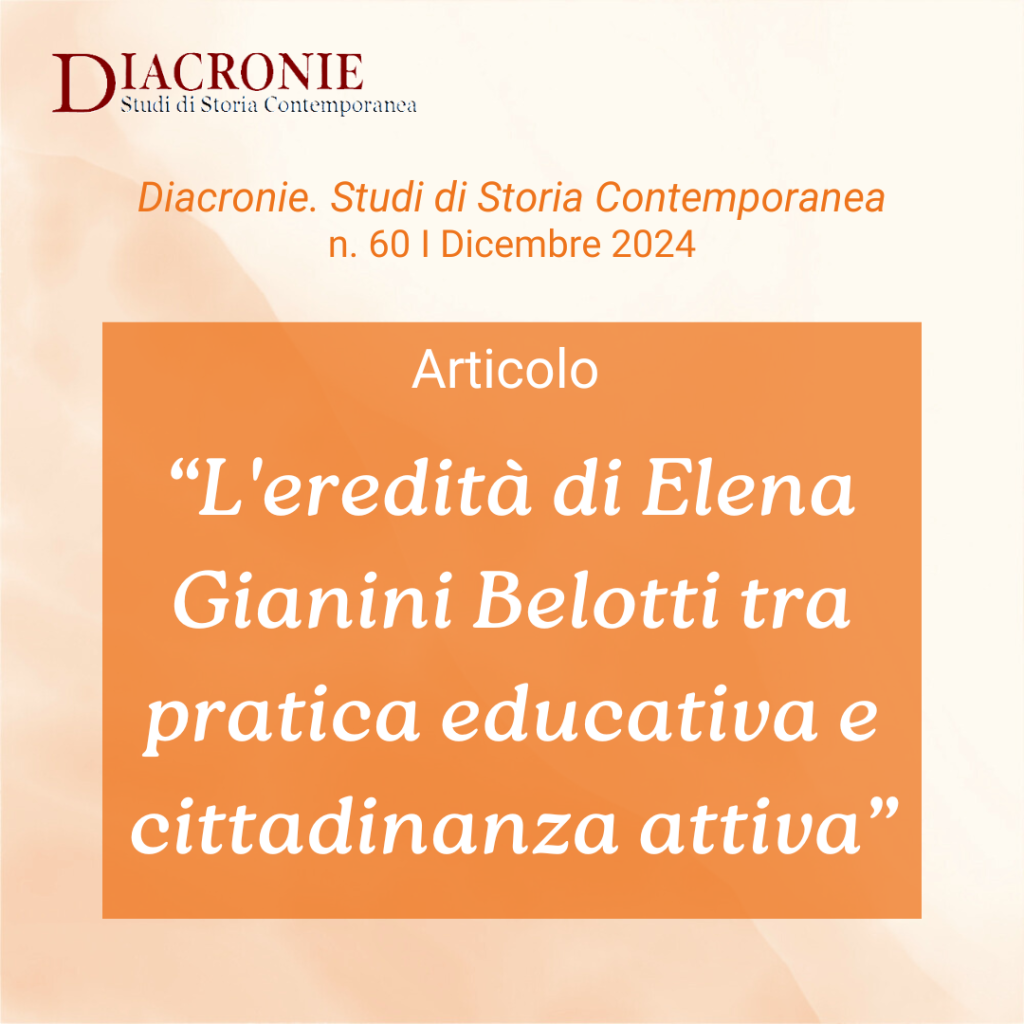 E’ online l’articolo L’eredità di Elena Gianini Belotti tra pratica educativa e cittadinanza attiva di Anna Scapocchin e Vittorina Maestroni, pubblicato nel n.60 I Dicembre 2024 della Rivista Diacronie. Studi di Storia Contemporanea. L’articolo esamina l’eredità del pensiero e della pratica di Elena Gianini Belotti, considerato pionieristico per i temi affrontati e per l’approccio esperienziale […]
