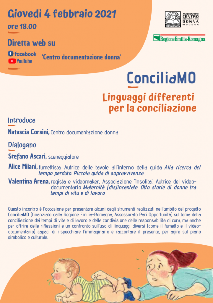 Giovedì 4 febbraio alle ore 18.00 in diretta web sul sito, sul canale YouTube e sulla pagina Facebook del Centro documentazione donna si terrà l’incontro ConciliaMO. Linguaggi differenti per la conciliazione. Introduce Natascia Corsini, Centro documentazione donna Dialogano Stefano Ascari, sceneggiatore Alice Milani, fumettista. Autrice delle tavole all’interno della guida Alla ricerca del tempo perduto. Piccola guida di sopravvivenza. Valentina Arena, regista e videomaker, Associazione ‘Insolita’. […]