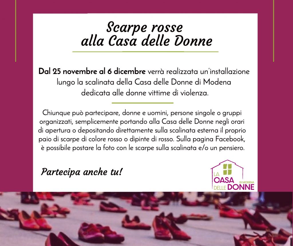 In occasione del 25 novembre 2019, Giornata internazionale per l’eliminazione della violenza contro le donne, ecco il programma della giornata presso la Casa delle Donne di Modena: ore 10.00, incontro con alcune classi delle scuole medie Carducci di Modena ore 12.oo, avvio dell’installazione “Scarpe rosse alla Casa delle Donne”. Dal 25 novembre al 6 dicembre […]