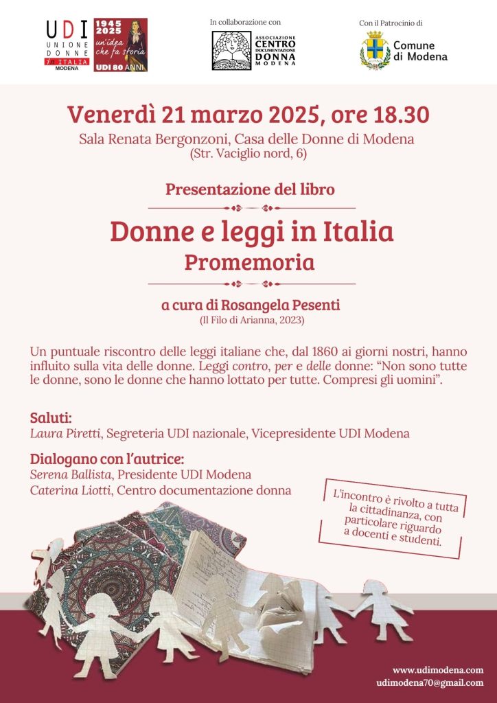 Venerdì 21 marzo 2025 ore 18.30 presso la Sala Renata Bergonzoni (Str. Vaciglio nord 6) si terrà la presentazione del libro Donne e leggi in Italia. Promemoria di Rosangela Pesenti (Il Filo di Arianna, 2023). Un puntuale riscontro delle leggi italiane che, dal 1860 ai giorni nostri, hanno influito sulla vita delle donne. Leggi contro, per e […]