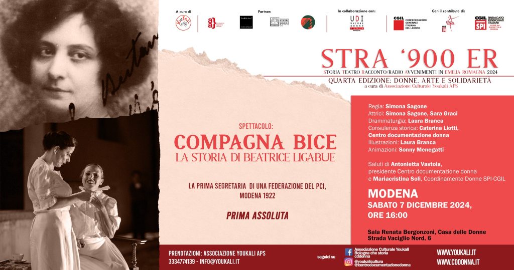 Sabato 7 dicembre 2024 alle ore 16.00 presso la Sala Renata Bergonzoni-Casa delle donne, (strada Vaciglio nord n. 6) si terrà la prima assoluta dello spettacolo Compagna Bice: La storia di Beatrice Ligabue. La prima Segretaria di una Federazione Del PCI, Modena 1922 promosso da Associazione culturale Youkali Aps e Centro documentazione donna. Due […]