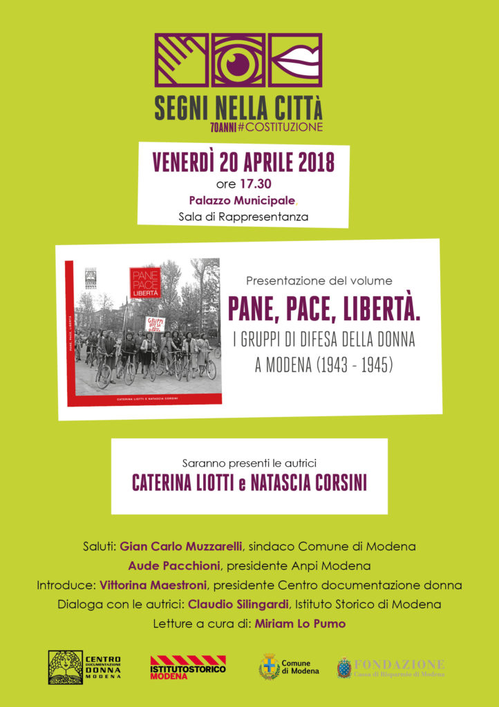 Vi aspettiamo venerdì 20 aprile alle ore 17.30 presso la Sala di Rappresentanza del Palazzo municipale alla presentazione dell’ultimo volume pubblicato nella collana editoriale “Storie Differenti” del Centro documentazione donna dal titolo PANE, PACE, LIBERTA’. I Gruppi di difesa della donna e per l’assistenza ai combattenti della libertà a Modena (1943 – 1945) di Caterina Liotti e […]