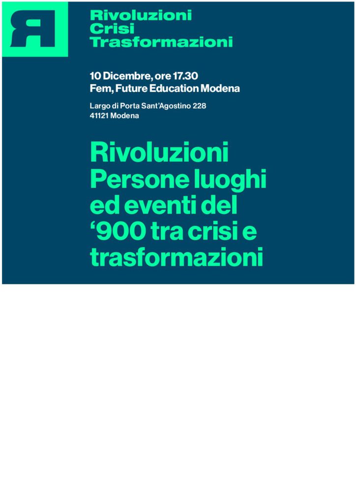 Carissime, carissimi vi invitiamo a partecipare martedì 10 dicembre 2019 alle ore 17.30, presso FEM-Future Education Modena (Largo di Porta Sant’Agostino 228), all’iniziativa “Rivoluzioni. Persone luoghi ed eventi del ‘900 tra crisi e trasformazioni” che Istituto Storico e Centro documentazione donna, in collaborazione con il Comune di Modena Comitato per la storia e le memorie […]