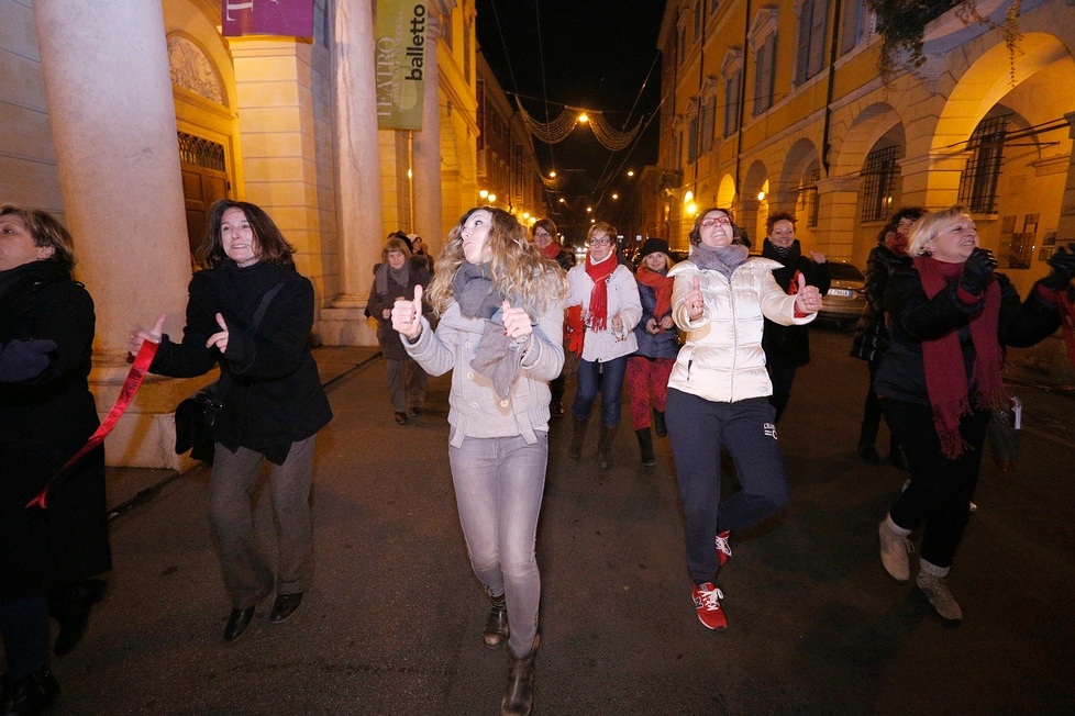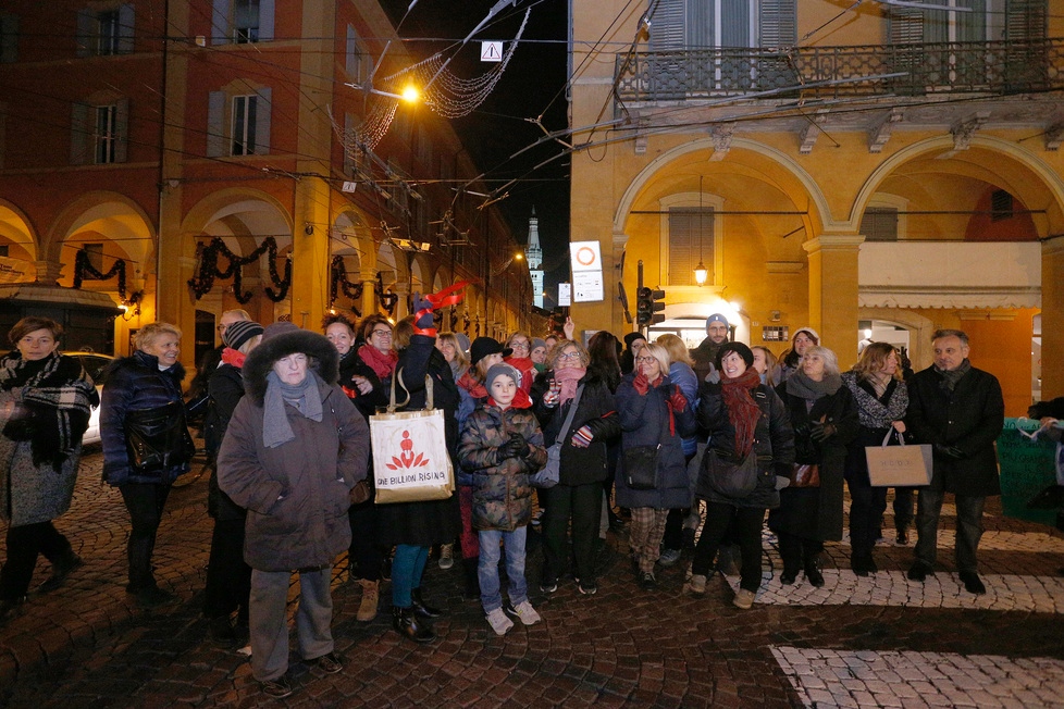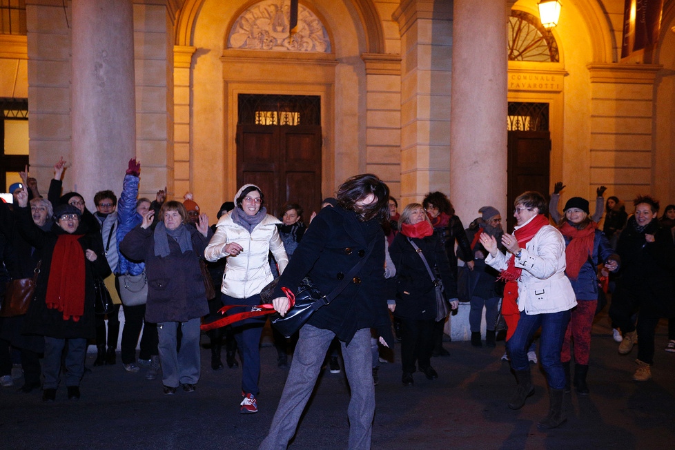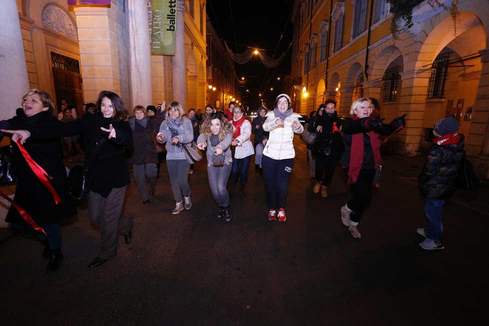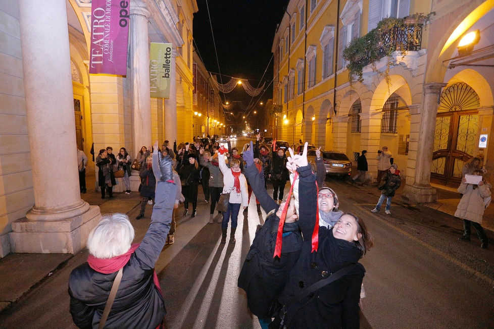 Per dire “Basta alla violenza sulle donne” ieri sera il corteo organizzato dalle associazioni femminili (Casa delle donne contro la violenza, Centro documentazione donna, Differenza Maternità, Donne nel mondo, Gruppo Donne e Giustizia, Udi di Modena e Coordinamento Italiano One Billion Rising), partito nel cuore della città tra via Emilia e Corso Canalgrande, si è fermato davanti al Teatro Comunale Pavarotti dove hanno parlato le donne delle Associazioni e dove si è svolto il Flash Mob che ha lanciato e presentato la Campagna 2016 “One Billion Rising Revolution”. A seguire lo spettacolo di danza “Vittime del Silenzio”, promosso da Comune di Modena, Centro documentazione donna, Federazione Nazionale Associazioni Scuole di Danza, ATER, Fondazione Teatro Comunale Modena, con il patrocinio della Regione Emilia Romagna, in un Teatro Comunale gremito di un pubblico molto giovane in una gioiosa partecipazione.