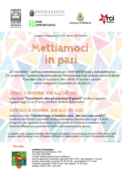 Domenica 18 novembre ore 16.00 si terrà presso la Ludoteca Strapapera (Via S.G. Bosco, 150) la lettura animata “I bambini così, le bambine cosà…Ma così cosà come?!?” condotta da Patrizia Comitardi rivolta a bambine e bambini dai 6 agli 11 anni. A seguire per i genitori è previsto un momento di incontro e confronto con Vittorina Maestro, presidente Centro documentazione donna.