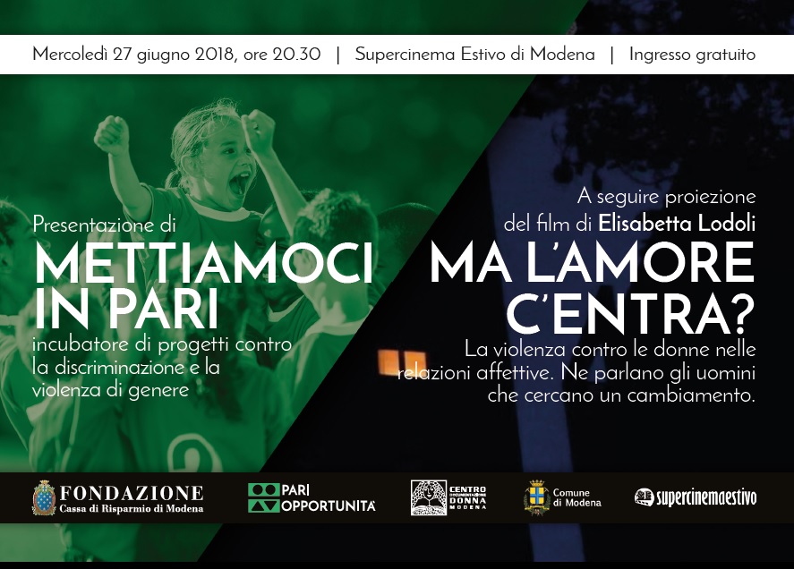Mercoledì 27 giugno alle ore 20.30 presso il Supercinema Estivo (viale Carlo Sigonio 386) si terrà l’iniziativa di presentazione del progetto “Mettiamoci in pari”, promosso da Fondazione Cassa di Risparmio di Modena e Centro documentazione donna, sul tema della discriminazione di genere, al fine di favorire una maggiore consapevolezza per comprenderne le radici culturali. “Mettiamoci in pari” è un incubatore di progetti che verranno messi in campo nel corso del 2018 tra attività di formazione e sensibilizzazione e iniziative di comunicazione sociale.