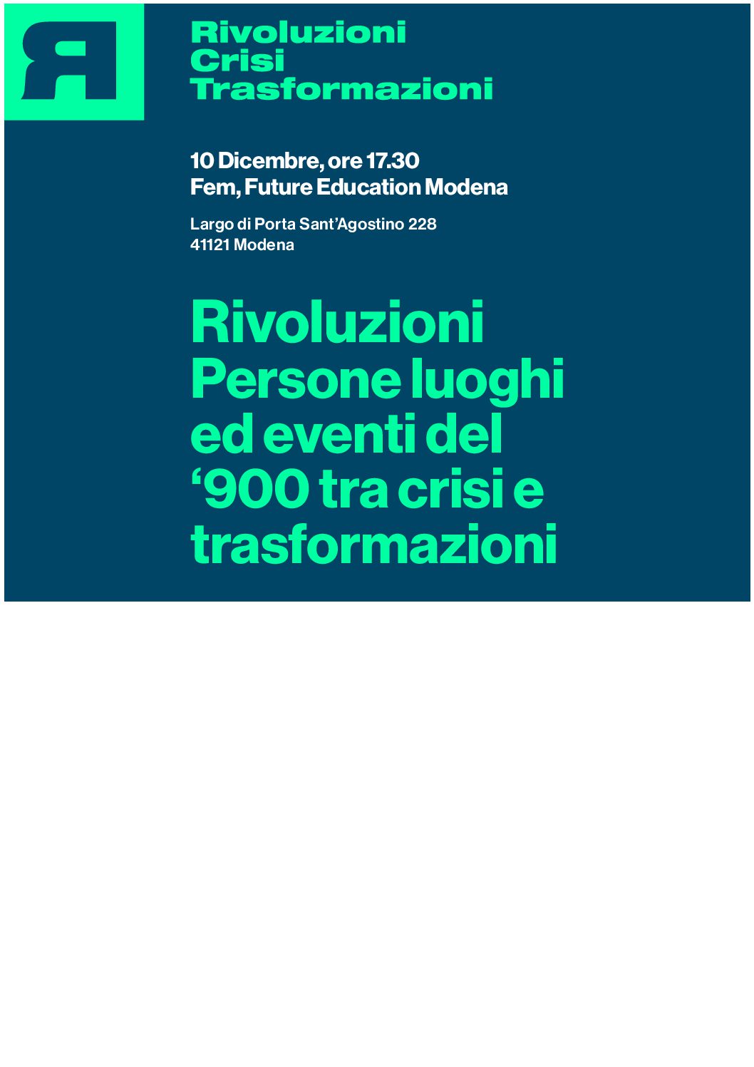 vi invitiamo a partecipare martedì 10 dicembre 2019 alle ore 17.30, presso FEM-Future Education Modena (Largo di Porta Sant’Agostino 228), all’iniziativa “Rivoluzioni. Persone luoghi ed eventi del ‘900 tra crisi e trasformazioni” che Istituto Storico e Centro documentazione donna, in collaborazione con il Comune di Modena Comitato per la storia e le memorie del ‘900, promuovono per presentare alla città l’omonimo progetto triennale, recentemente approvato dalla Fondazione di Modena, che ci accompagnerà nei prossimi anni con attività didattiche, di ricerca e iniziative culturali nelle occasioni celebrative degli anniversari del calendario civile.