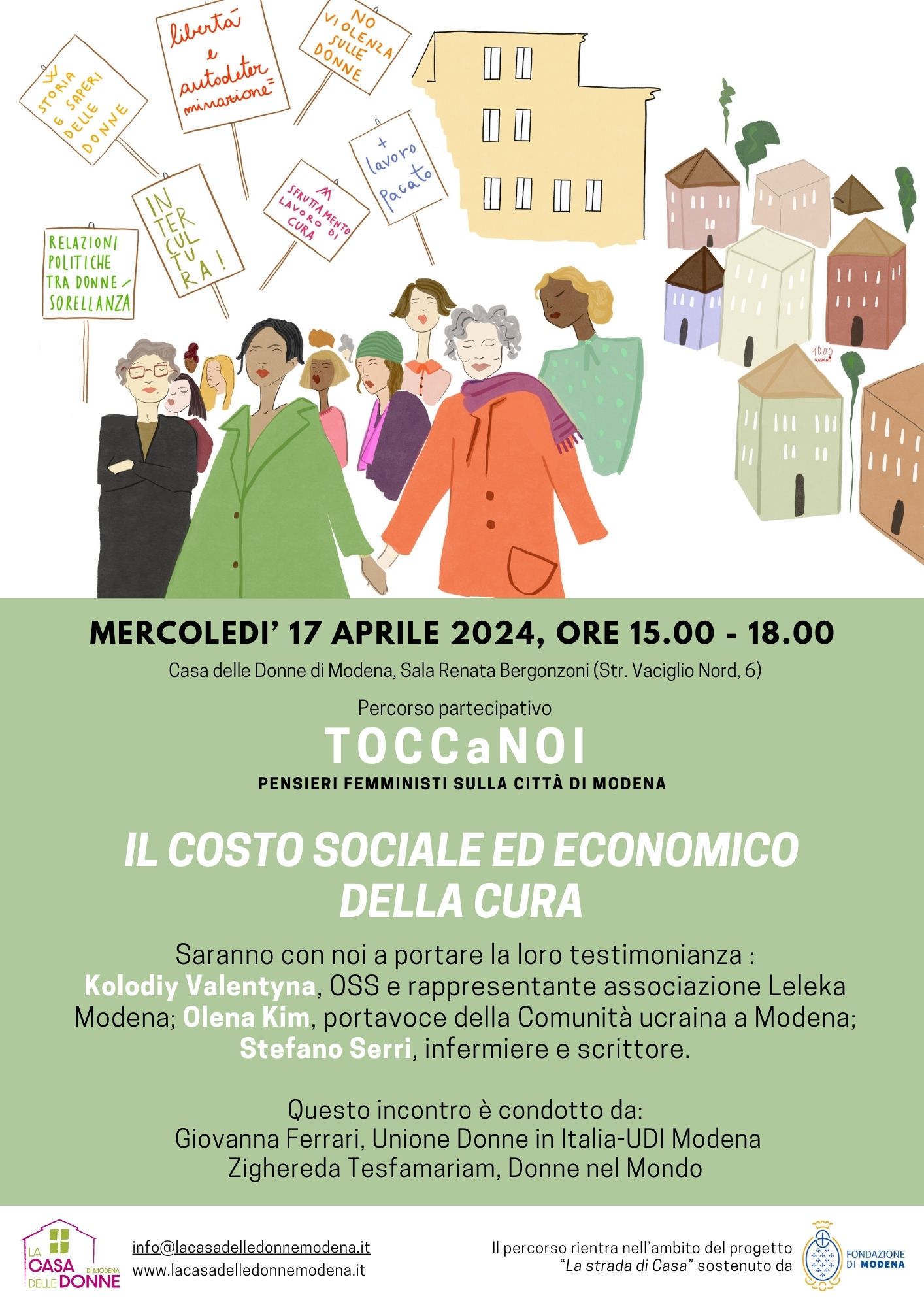 Il percorso partecipativo “TOCCaNOI. Pensieri femministi sulla città di Modena” intende aprire uno spazio di confronto con le donne e gli uomini sull’abitare la città, a partire dai corpi e dalle relazioni, per riflettere su servizi, lavoro, diritti e ambiente. L’obiettivo del percorso è scrivere delle Raccomandazioni femministe da presentare alla città e rientra nell’ambito del progetto “La strada di Casa. Percorsi per il benessere relazionale ed economico alla Casa delle Donne di Modena” sostenuto da Fondazione di Modena.