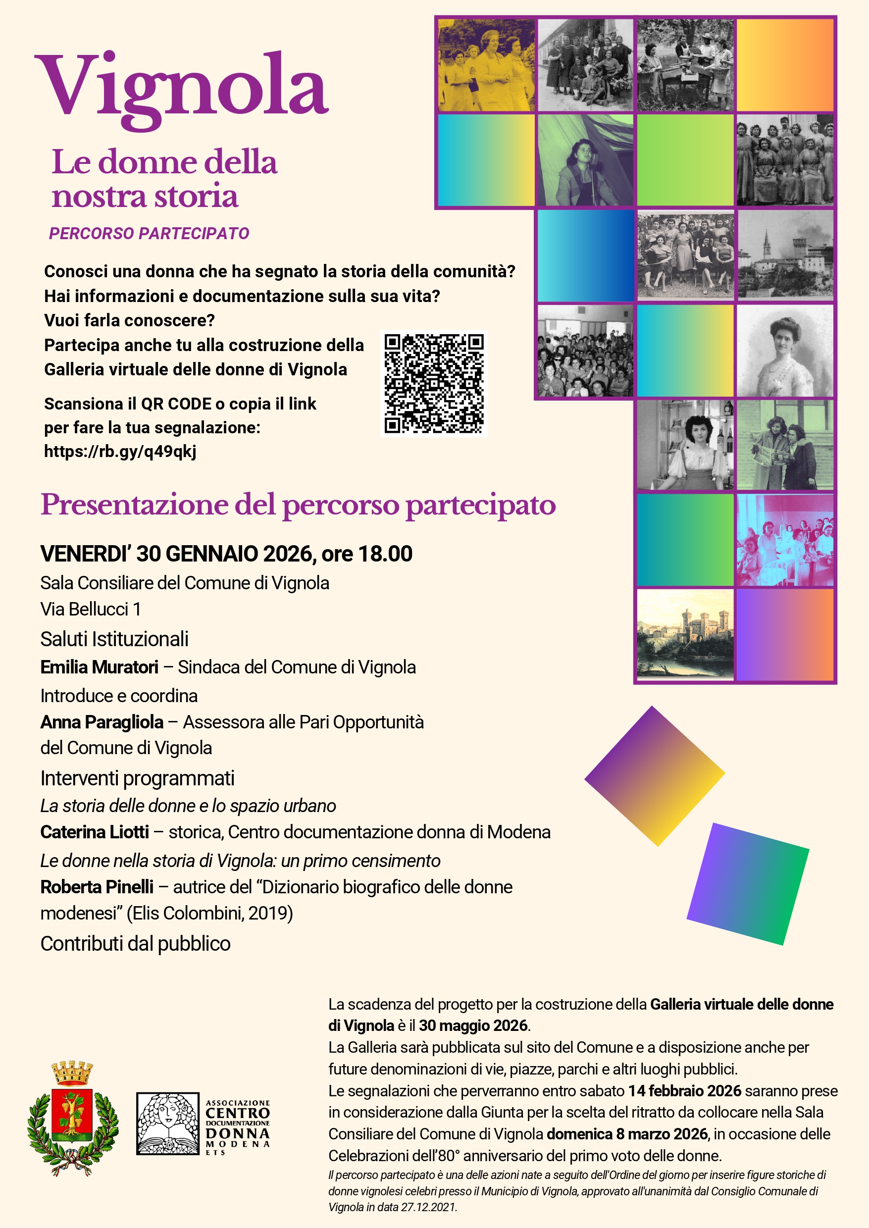 Il percorso partecipato è dedicato al riconoscimento delle figure femminili che hanno contribuito alla storia della comunità di Vignola: le cittadine e i cittadini sono invitati a segnalare donne significative, fornendo informazioni e documentazione utili alla costruzione della Galleria virtuale delle donne di Vignola. Le segnalazioni possono essere inviate tramite il QR code o il link.