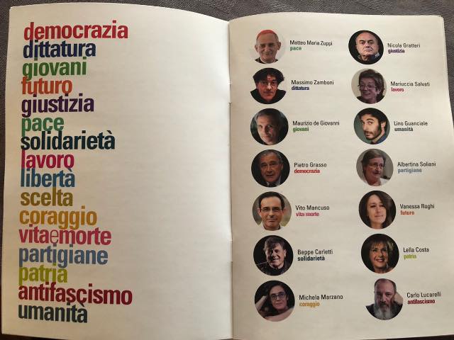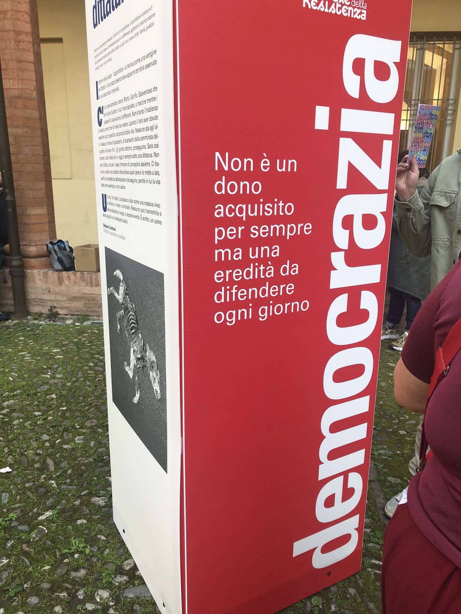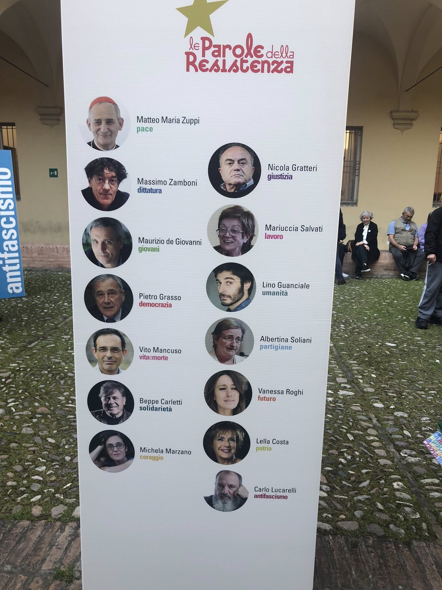 Giovedì 24 aprile 2025, ore 18:00 presso il Chiostro Biblioteca A. Delfini (Corso Canalgrande 103, Modena) si terrà l’Inaugurazione installazione “Le parole della Resistenza” con testi originali di Beppe Carletti, Lella Costa, Maurizio De Giovanni, Pietro Grasso, Nicola Gratteri, Lino Guanciale, Carlo Lucarelli, Vito Mancuso, Michela Marzano, Vanessa Roghi, Mariuccia Salvati, Albertina Soliani, Massimo Zamboni, S.E. Cardinale Matteo Maria Zuppi. Letture registrate di Ottavia Piccolo da Irma Marchiani, Lettera al fratello e da Piero Calamandrei, discorso sulla Resistenza, Ivrea 1954. Elaborazione tecnica registrazione audio Paolo Borghi.