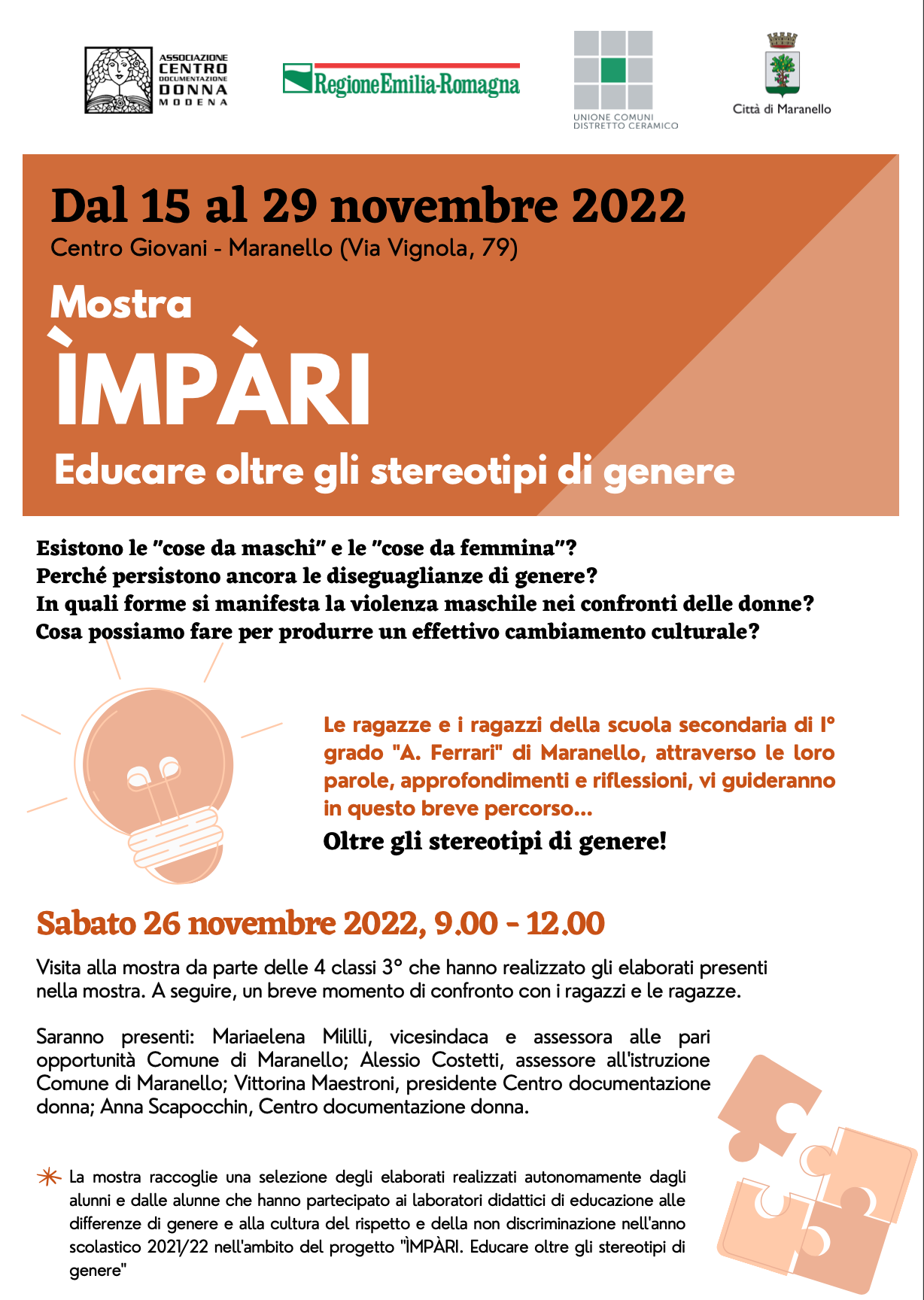 In occasione del 25 novembre – giornata internazionale per l’eliminazione della violenza contro le donne, nell’ambito delle iniziative promosse dall’Unione del Distretto Ceramico e del progetto ÌMPÀRI. Educare oltre gli stereotipi di genere, dal 15 al 29 novembre 2022 presso il Centro Giovani di Maranello (Via Vignola, 79) si terrà la mostra ÌMPÀRI. Educare oltre gli stereotipi di genere promossa dal Centro documentazione donna in collaborazione con la Città di Maranello.