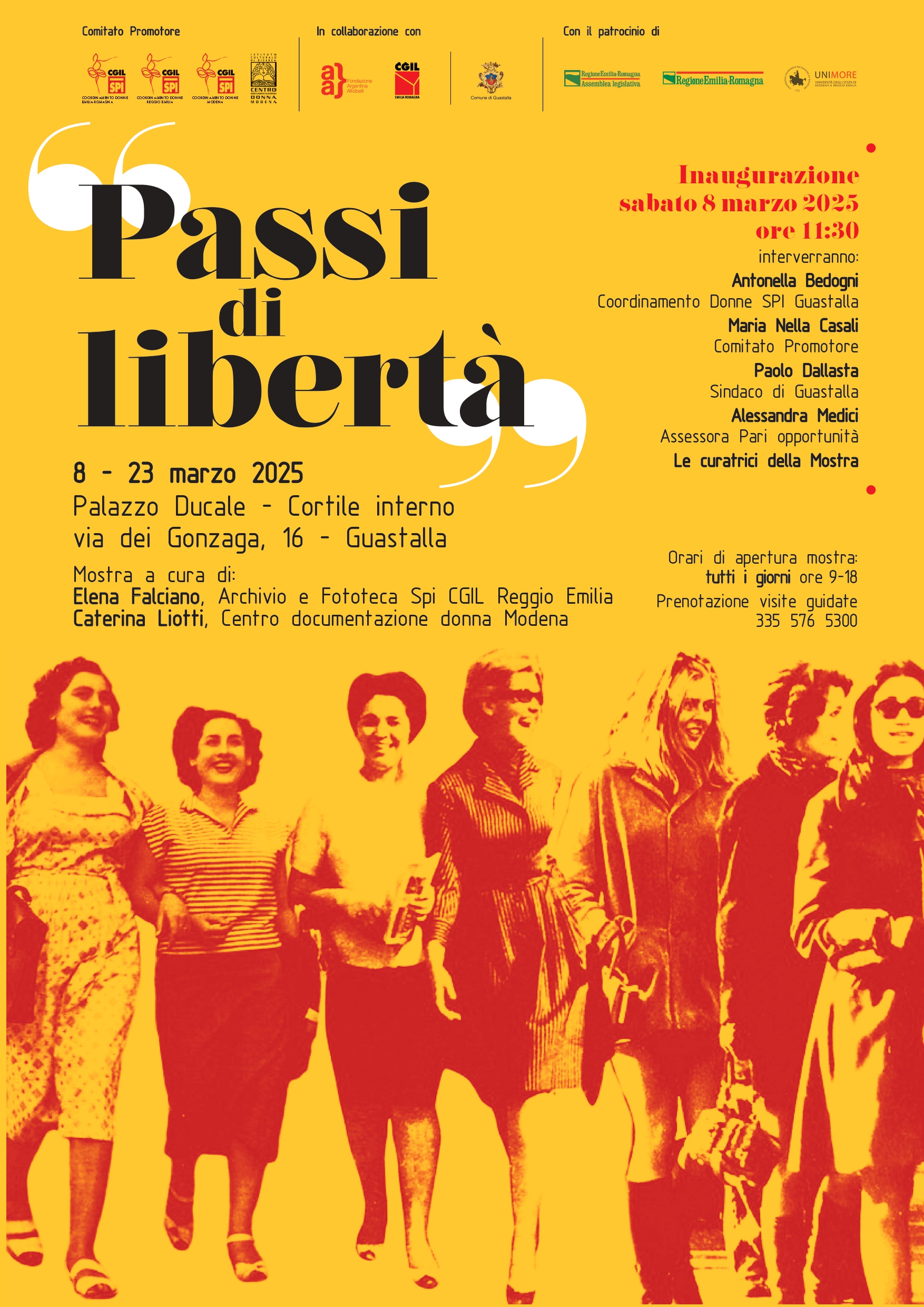 Nuovo allestimento della mostra Passi di libertà. Il cammino dei nostri primi 70 anni curata da Elena Falciano, archivio e fototeca Spi CGIL Reggio Emilia e Caterina Liotti, Centro documentazione donna promossa dal Coordinamento Donne SPI CGIL di Reggio Emilia, unitamente al Coordinamento Donne SPI CGIL di Modena ed Emilia Romagna e al Centro documentazione donna e in collaborazione con Fondazione Altobelli e Cgil, dal 8 al 23 marzo 2025 presso Palazzo Ducale – Cortile interno (via dei Gonzaga, 16) a Guastalla