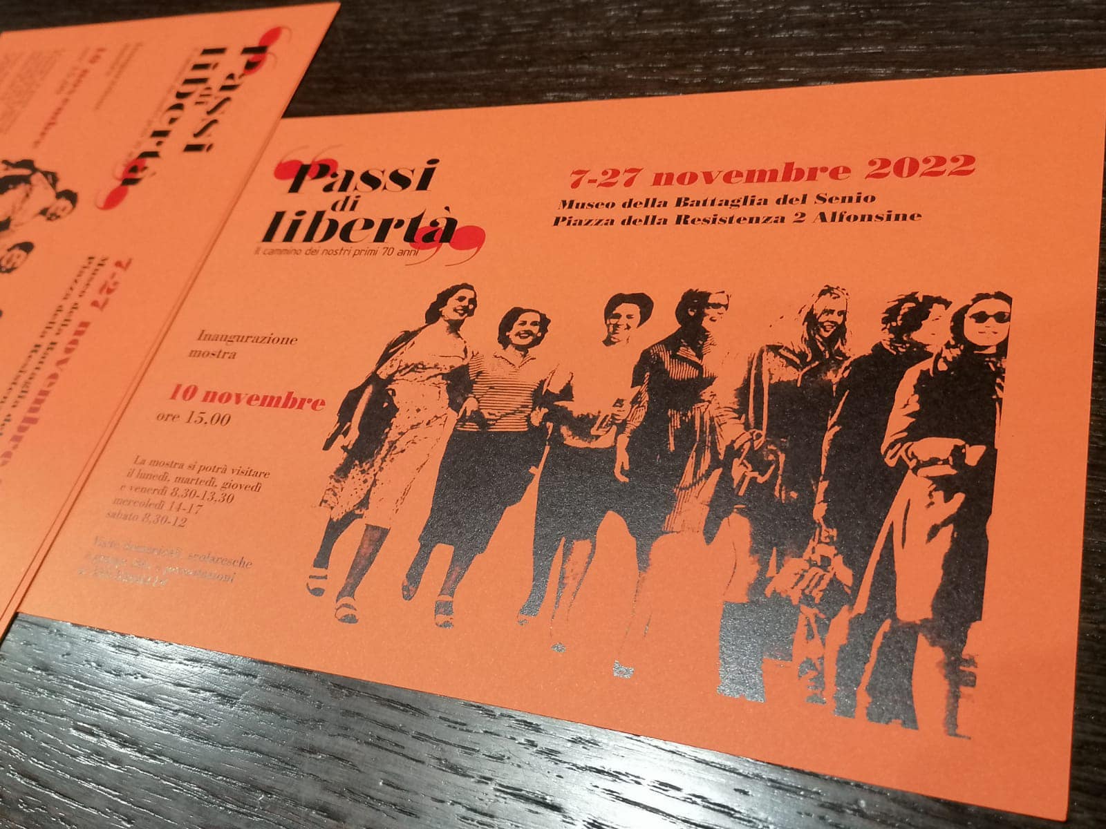 Dal 7 al 27 novembre 2022 presso il Museo della Battaglia del Senio di Alfonsine (RA) si terrà la mostra Passi di libertà. Il cammino dei nostri primi 70 anni curata da Elena Falciano, archivio e fototeca Spi CGIL Reggio Emilia e Caterina Liotti, Centro documentazione donna promossa dal Coordinamento Donne SPI CGIL di Reggio Emilia, unitamente al Coordinamento Donne SPI CGIL di Modena ed Emilia Romagna e al Centro documentazione donna e in collaborazione con Fondazione Altobelli e Cgil.