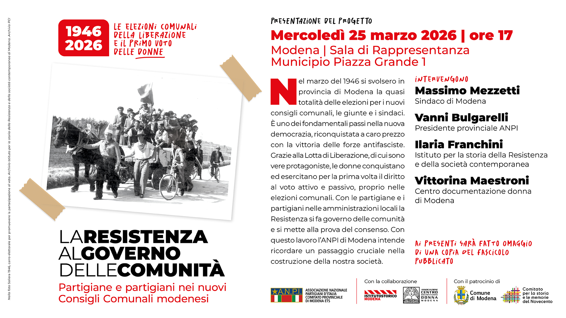 Mercoledì 25 marzo 2026 alle ore 17.00 presso la Sala di Rappresentanza del Municipio di Modena si terrà la presentazione della pubblicazione “La Resistenza al governo delle comunità. Partigiane e partigiani nei nuovi Consigli Comunali modenesi” a cura di Anpi Modena, in occasione degli 80 anni dalle elezioni comunali del 1946, in collaborazione con Istituto Storico di Modena e Centro documentazione donna e con il patrocinio del Comune di Modena-Comitato per la Storia e le Memorie del Novecento