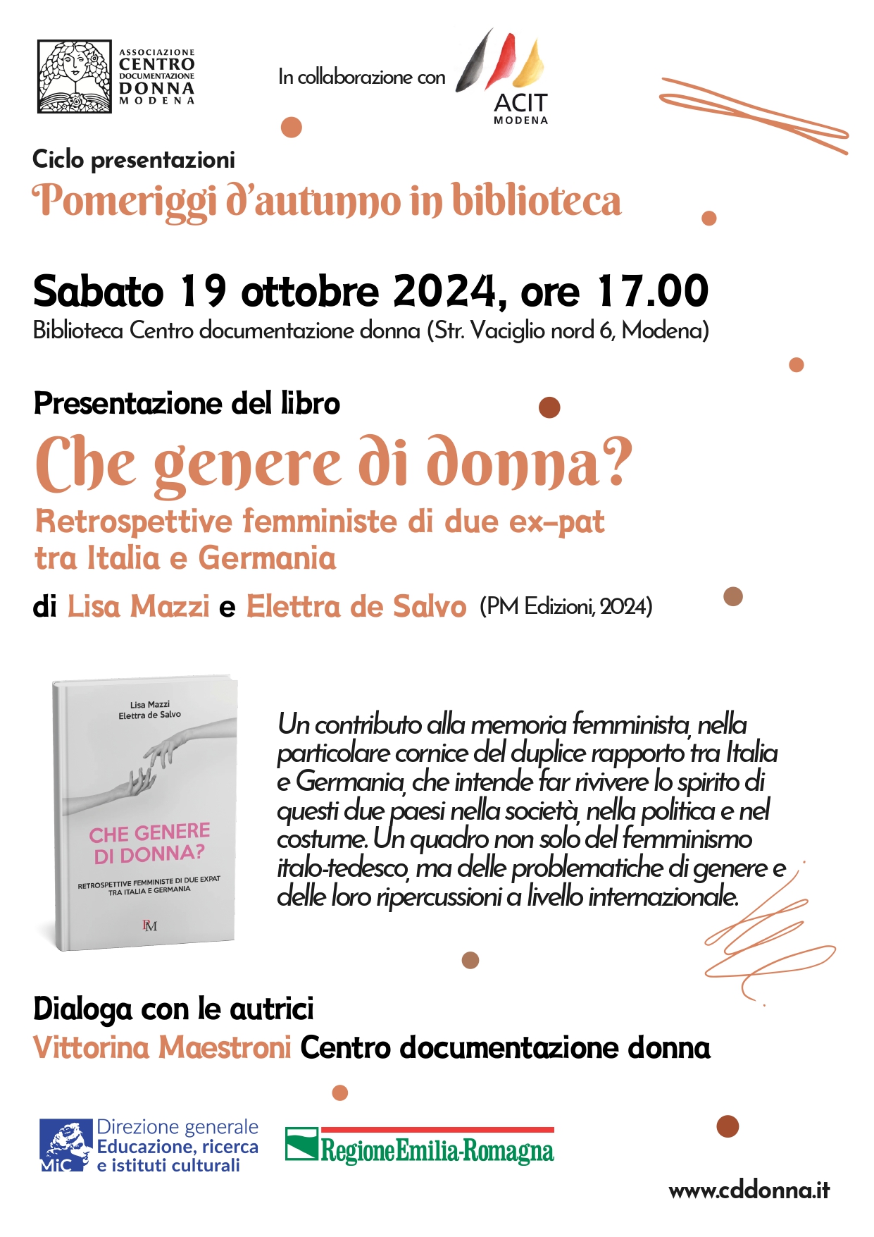 Dal 19 ottobre al 4 novembre 2024 si terrà presso la Biblioteca del Centro documentazione donna (Str. Vaciglio nord 6, Modena) il ciclo di presentazioni Pomeriggi d’autunno in biblioteca promosso dal Centro documentazione donna.
