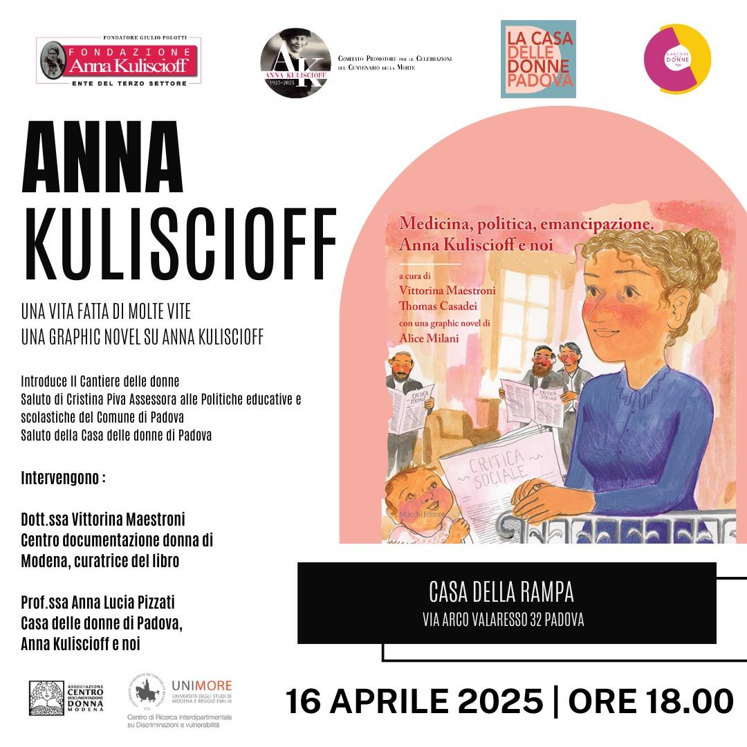 Mercoledì 16 aprile 2025 alle ore 18:00 presso Casa della Rampa di Padova (Via Arco Valaresso, 32) si terrà la presentazione del libro Medicina, politica, emancipazione. Anna Kuliscioff e noi (con una graphic novel di Alice Milani) a cura di Vittorina Maestroni e Thomas Casadei (Mucchi, 2024).