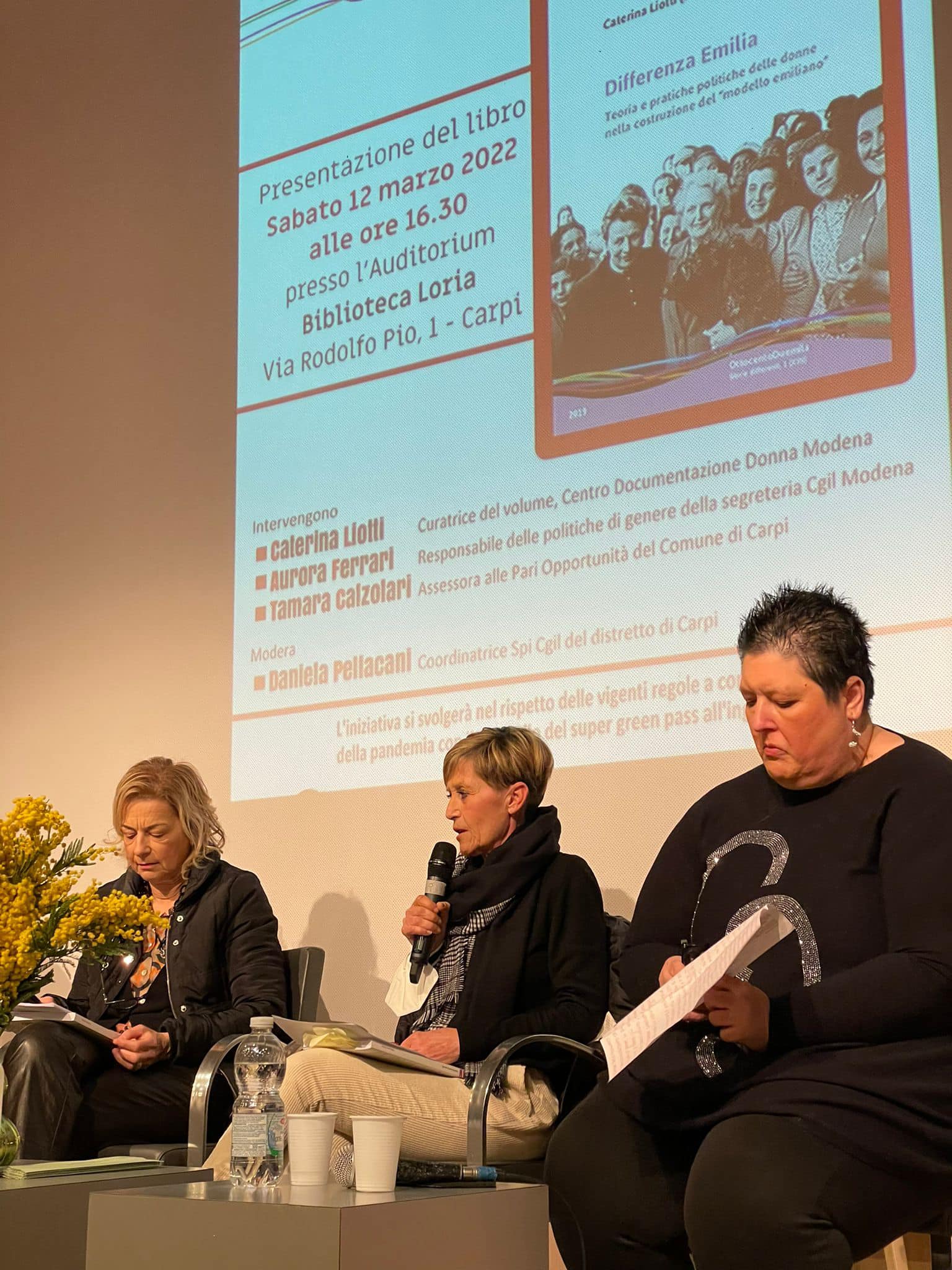 Intervengono: Caterina Liotti, Centro documentazione donna; Aurora Ferrari, Cgil Modena; Tamara Calzolari, Assessora pari opportunità Comune di Carpi. Modena: Daniela Pellacani, Spi Cgil Carpi.