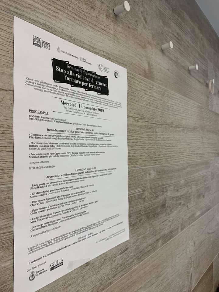 Mercoledì 13 novembre dalle ore 9.00 alle ore 18.00 presso la Sala Conferenze della Casa delle Donne di Modena si è tenuto il seminario di formazione “Stop alle violenze di genere: formare per fermare”, progettato dal Centro documentazione donna, nell’ambito del progetto “Mettiamoci in pari. Incubatore di progetti contro la discriminazione e la violenza di genere”, promosso dalla Fondazione di Modena. L’iniziativa è promossa con il patrocinio di Comune di Modena e G.I.U.L.I.A. giornaliste. Scarica la locandina.