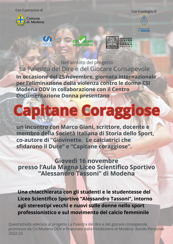 Giovedì 16 novembre 2023 dalle 10.00 alle 12.00 presso l’Aula Magna del Liceo Scientifico Tassoni di Modena si terrà Capitane coraggiose, un incontro con Marco Giani, scrittore, docente e membro della Società Italiana di Storia dello Sport, co-autore di Giovinette. Le calciatrici che sfidarono il Duce” e autore di “Capitane coraggiose”. Chiacchierata con gli studenti […]