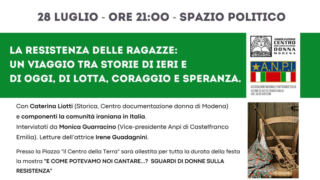 Venerdì 28 luglio 2023 alle ore 21.00 presso lo Spazio Politico della Festa Bosco Albergati (Via Lavichielle 6, Castelfranco Emilia) si terrà la l’incontro “La Resistenza delle ragazze: un viaggio tra storie di ieri e di oggi, di lotta, coraggio e speranza”, promosso da Centro documentazione donna e ANPI Castelfranco Emilia. Monica Guarracino, vicepresidente ANPI Castelfranco […]