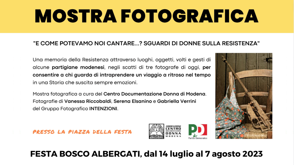 Dal 14 luglio al 7 agosto 2023 presso la piazza “Il Centro della Terra” – Festa Bosco Albergati (Via Lavichielle 6, Castelfranco Emilia) sarà allestita la mostra “E come potevamo noi cantare…? Sguardi di donne sulla Resistenza” a cura del Centro documentazione donna con fotografie di Vanessa Riccobaldi, Serena Elsanino e Gabriella Verrini del Gruppo Fotografico “Intenzioni”. […]