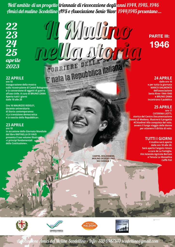 Nell’ambito del programma di iniziative Il Mulino nella Storia, martedì 25 aprile 2023 alle ore 17.00 presso il Mulino Scodellino di Castel bolognese (Via Canale 7) si terrà l’incontro #Cittadine! Alla conquista del voto conCaterina Liotti, Centro documentazione donna. Locandina
