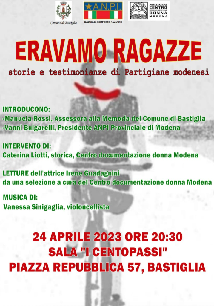 Lunedì 24 aprile 2023 alle ore 20.30 presso la Sala “I centopassi” di Bastiglia (Piazza Repubblica 57) si terrà l’incontro “Eravamo ragazze. Storie e testimonianze di Partigiane modenesi” promosso da Comune di Bastiglia, ANPI Bomporto-Bastiglia-Ravarino e Centro documentazione donna. Introducono: Manuela Rossi, Assessora alla memoria Comune di Bastiglia; Vanni Bulgarelli, Presidente ANPI Provinciale Modena. Intervento di Caterina […]