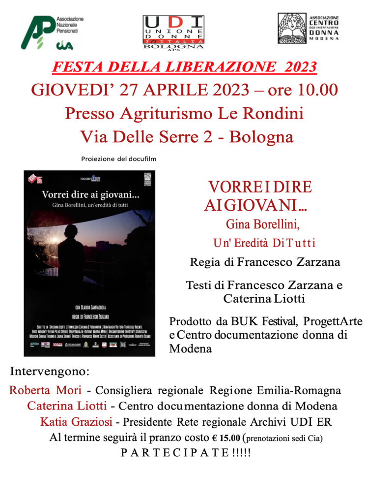 Giovedì 27 aprile 2023 alle ore 10.00 presso Agriturismo Le Rondini di Bologna (Via Delle Serre 2) si terrà la proiezione del docufilm VORREI DIRE AI GIOVANI…Gina Borellini, un’ eredità di tutti, regia di Francesco Zarzana. Intervengono: Roberta Mori, Consigliera regionale Regione Emilia-Romagna; Caterina Liotti, Centro documentazione donna; Katia Graziosi, Presidente Rete regionale Archivi UDI ER. Locandina