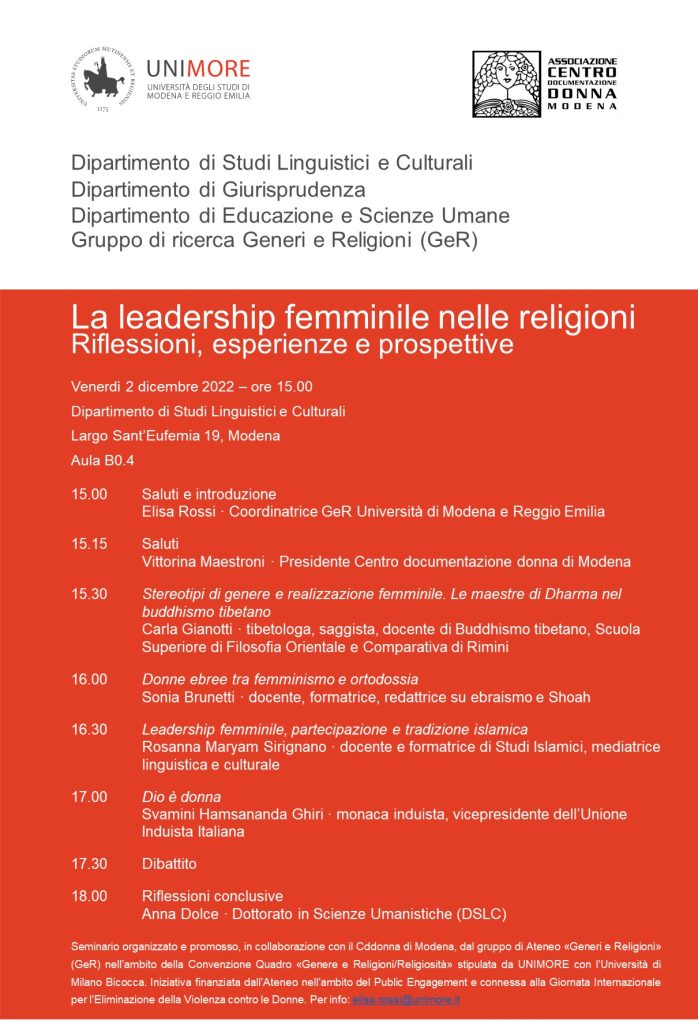 Venerdì 2 dicembre 2022 alle ore 15.00 presso l’Aula B0.4 del Dipartimento di Studi Linguistici e Culturali di Unimore (Largo Sant’Eufemia 19) si terrà il seminario “La leadership femminile nelle religioni Riflessioni, esperienze e prospettive” organizzato e promosso dal gruppo di Ateneo “Generi e Religioni” in collaborazione con il Centro documentazione donna. Introduzione: Elisa Rossi · Coordinatrice […]