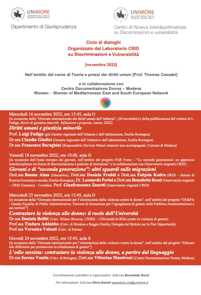 Nell’ambito del corso di Teoria e prassi dei diritti umani [Prof. Thomas Casadei] e in collaborazione con Centro documentazione donna e Women – Women of Mediterranean East and South European Network, giovedì 24 novembre 2022 alle ore 15:45 presso l’aula S (Dipartimento di Giurisprudenza – Unimore) si terrà l’incontro L’odio sessista: contrastare la violenza alle donne, a […]