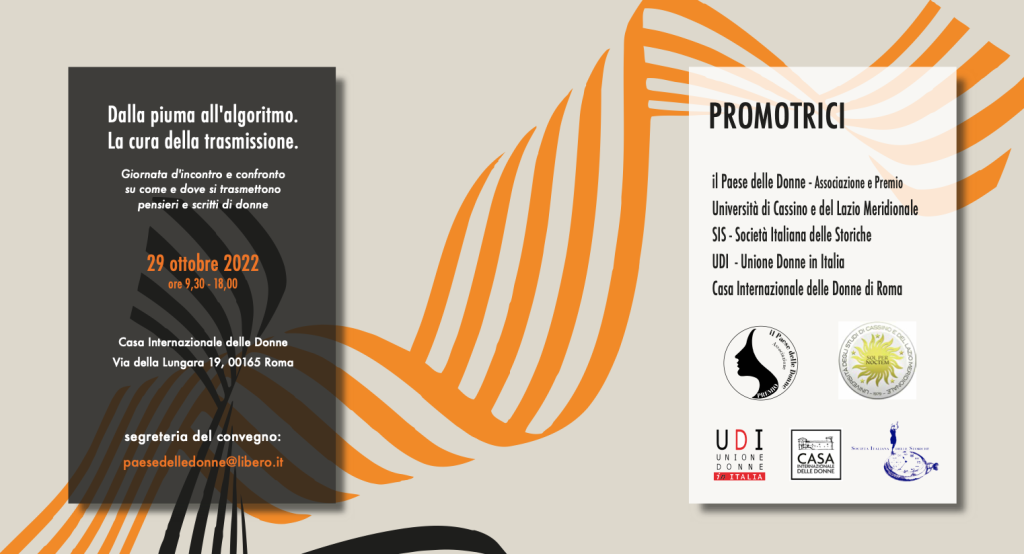 Sabato 29 ottobre 2022 dalle 9.30 alle 18 presso la Casa internazionale delle donne di Roma si terrà la giornata d’incontro e confronto su come e dove si trasmettono pensieri e scritti di donne Dalla piuma all’algoritmo. La cura della trasmissione promossa da Il paese delle Donne (Associazione e Premio), Università di Cassino e del Lazio Meridionale, Società Italiana […]