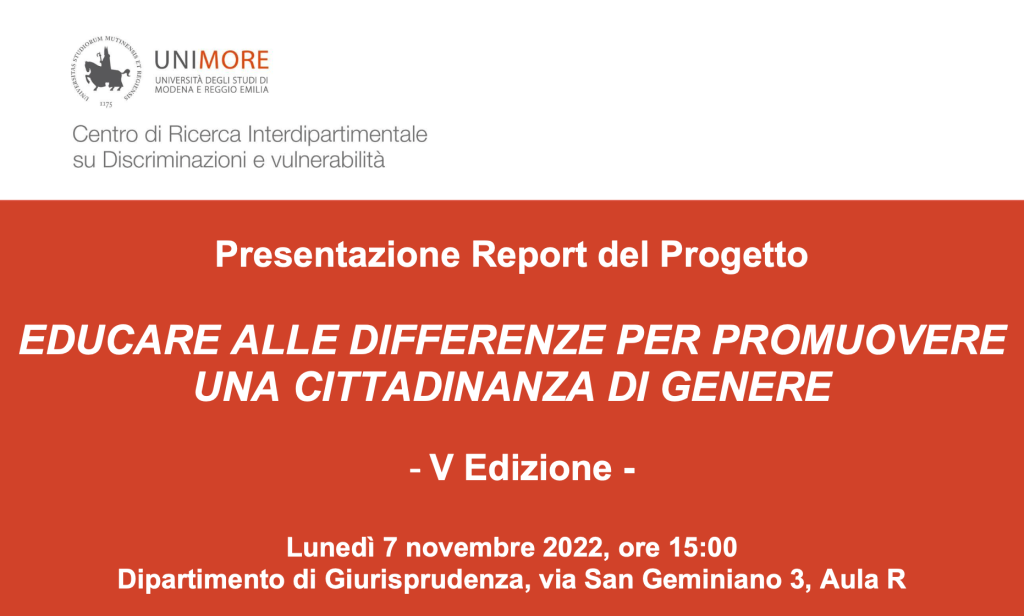 Lunedì 7 novembre 2022 alle ore 15.00 presso l’Aula R del Dipartimento di Giurisprudenza (via San Geminiano 3) si terrà la presentazione del Report del progetto “Educare alle differenze per promuovere la cittadinanza di genere – V edizione”. Intervengono: Grazia Baracchi, Assessora all’Istruzione, Sport, Formazione professionale e Pari Opportunità del Comune di Modena Thomas Casadei, Professore […]
