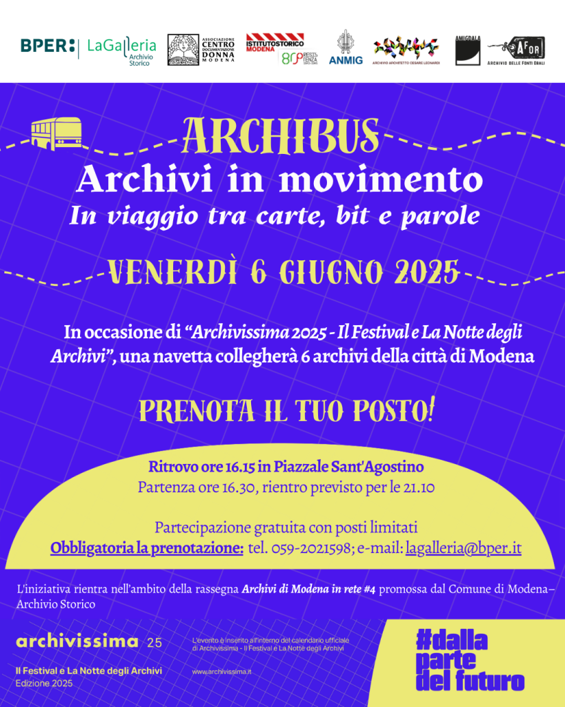 In occasione di Archivissima. Il festival e la notte degli archivi – edizione 2025, venerdì 6 giugno 2025 dalle ore 16.30 si terrò la nuova edizione di Archibus. Archivi in movimento: in viaggio tra carte, bit e parole, una navetta collegherà 6 archivi della città di Modena Ritrovo ore 16.15. Partenza ore 16.30 in Piazzale Sant’Agostino, […]