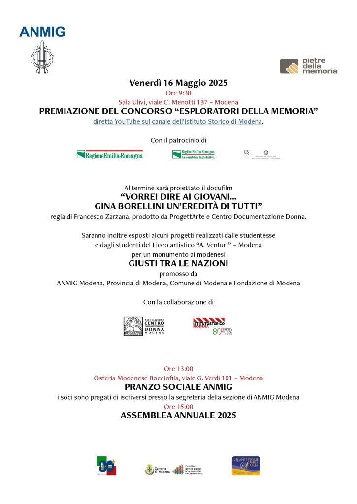 Venerdì 16 maggio 2025 ore 9.30 presso la Sala Ulivi a Modena (Viale Ciro Menotti 137) si terrà la Cerimonia di premiazione del concorso “Esploratori della memoria”-11° edizione, che ha visto la partecipazione delle scuole di ogni ordine e grado della regione Emilia-Romagna per il censimento e la catalogazione delle “Pietre della Memoria”, stili, monumenti etc. inerenti il […]