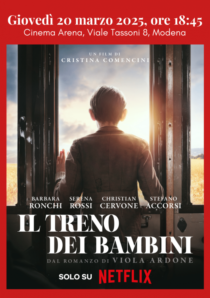 Giovedì 20 marzo 2025 a partire dalle 18.45 presso il Cinema Arena di Modena si terrà la proiezione del film Il treno dei bambini, regia di Cristina Comencini (Italia, 2o24). Tratto dall’omonimo romanzo di Viola Ardone (Einaudi), tradotto in venticinque lingue, Il treno dei bambini è un viaggio tra la miseria, l’ignoranza, il pregiudizio, ma anche una storia di solidarietà e […]