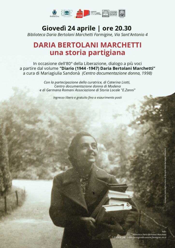 Giovedì 24 aprile 2025 alle ore 20.30 presso la Biblioteca Daria Bertolani Marchetti di Formigine (Via Sant’Antonio 4) si terrà l’incontro “Daria Bertolani Marchetti. Una storia partigiana”, un dialogo a più voci in occasione dell’80° anniversario della Liberazione a partire dal volume “Diario (1944-1947) Daria Bertolani Marchetti” a cura di Mariagiulia Sandonà (Centro documentazione donna, […]